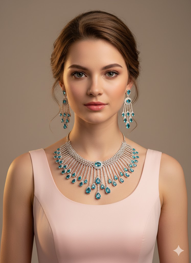 Dive into elegance with this dazzling jewelry set, featuring a necklace and matching earrings. The necklace is a showstopper with its cascading design of vibrant blue teardrop crystals, beautifully arranged along silver chains to create a waterfall effect. The earrings mirror the necklace's charm, each showcasing a central blue crystal surrounded by smaller sparkling stones, complemented by dangling teardrop crystals. Perfect for weddings, galas, or formal occasions, this jewelry set captures the essence of timeless sophistication while adding a splash of bold color to your ensemble. Make waves wherever you go!