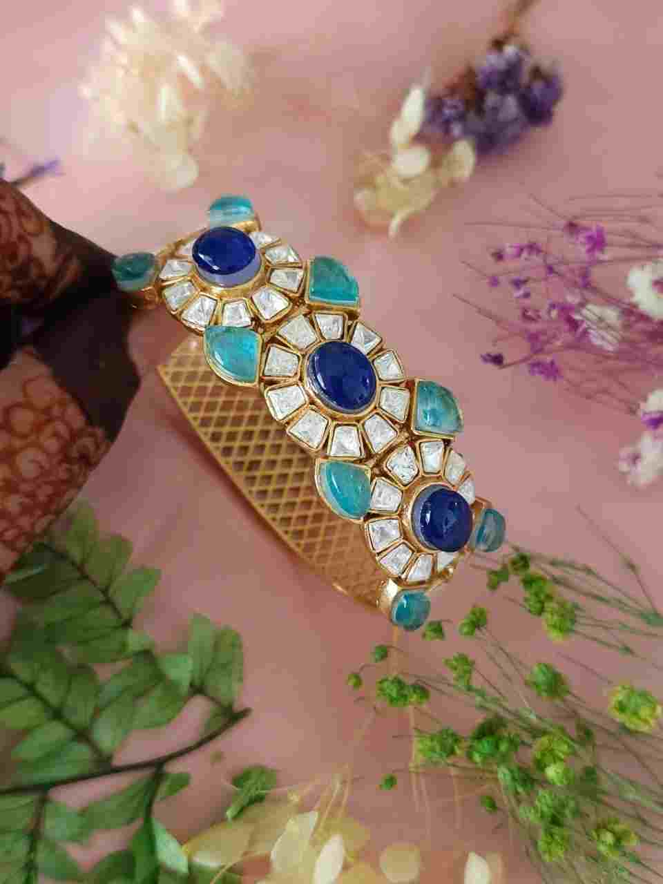 This exquisite bracelet features a gold band with a lattice pattern, adorned with large, round blue gemstones at its center. Surrounding these central stones are smaller, white, diamond-shaped stones arranged in a floral pattern, complemented by turquoise-colored stones. The intricate design and vibrant colors make this bracelet a stunning piece of jewelry, perfect for special occasions.
