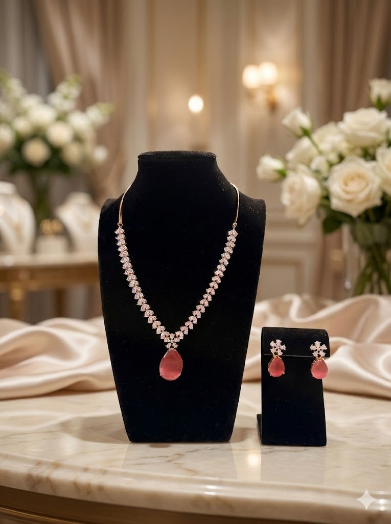 Radiate soft elegance with this romantic jewelry set, featuring a delicate vine of marquise-cut crystals that leads to a captivating, rose-pink teardrop pendant. Plated in a warm rose-gold tone, the Y-style silhouette flatters the neckline and is perfectly paired with matching floral drop earrings for a graceful finish.
