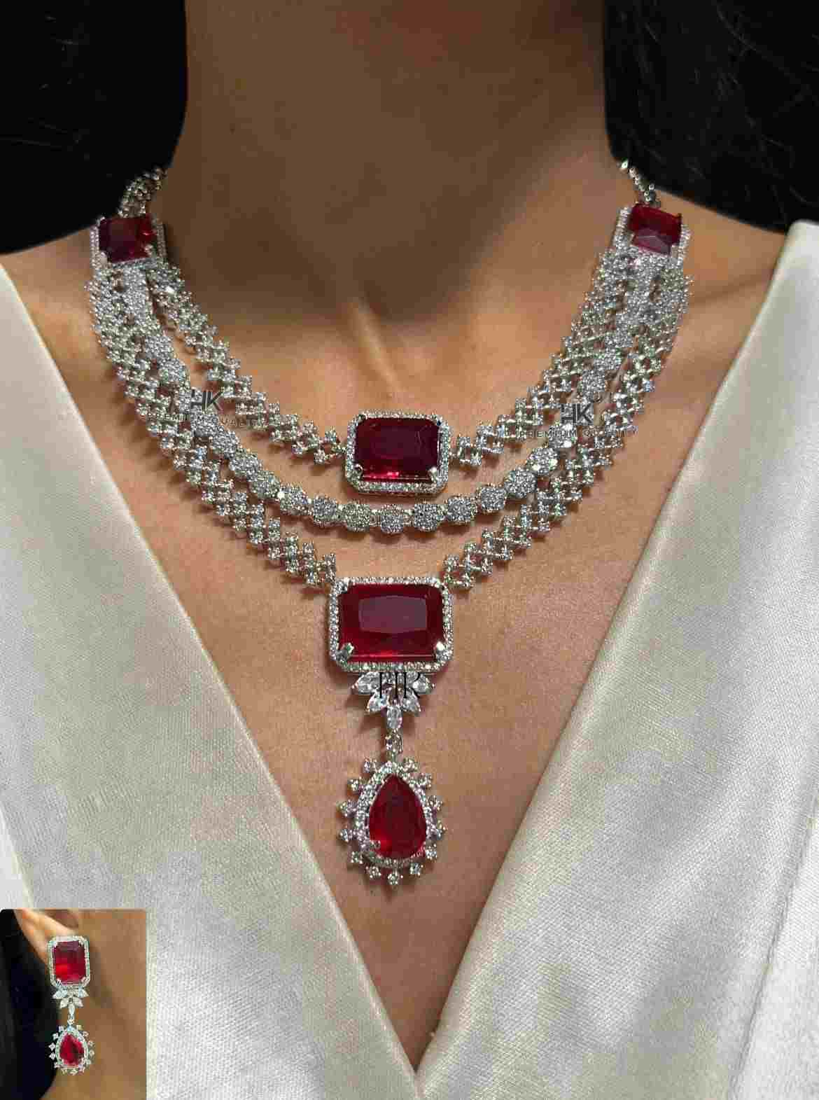 This exquisite necklace set features a combination of large, rectangular, and teardrop-shaped ruby gemstones, each surrounded by a halo of sparkling diamonds. The necklace is composed of three layers of diamond-encrusted chains, with the central layer featuring a prominent rectangular ruby. The lower part of the necklace has a dangling teardrop-shaped ruby, adding elegance and sophistication to the piece. The matching earrings feature a rectangular ruby with a teardrop-shaped ruby pendant, both surrounded by diamonds. This luxurious jewelry set is perfect for special occasions and adds a touch of opulence to any outfit.