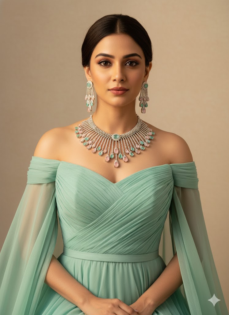 Add a splash of luxury to your collection with this exquisite jewelry set, featuring a necklace and matching earrings. The necklace is a masterpiece of design, showcasing alternating pink and mint teardrop gemstones, beautifully set in polished silver. The pattern creates an elegant symmetry that exudes grace. The earrings are a perfect complement, cascading with matching teardrop gemstones to complete the set's cohesive charm. Ideal for weddings, cultural celebrations, or formal occasions, this jewelry set brings together vibrant colors and timeless sophistication to make a lasting impression. Shine with style and elegance!