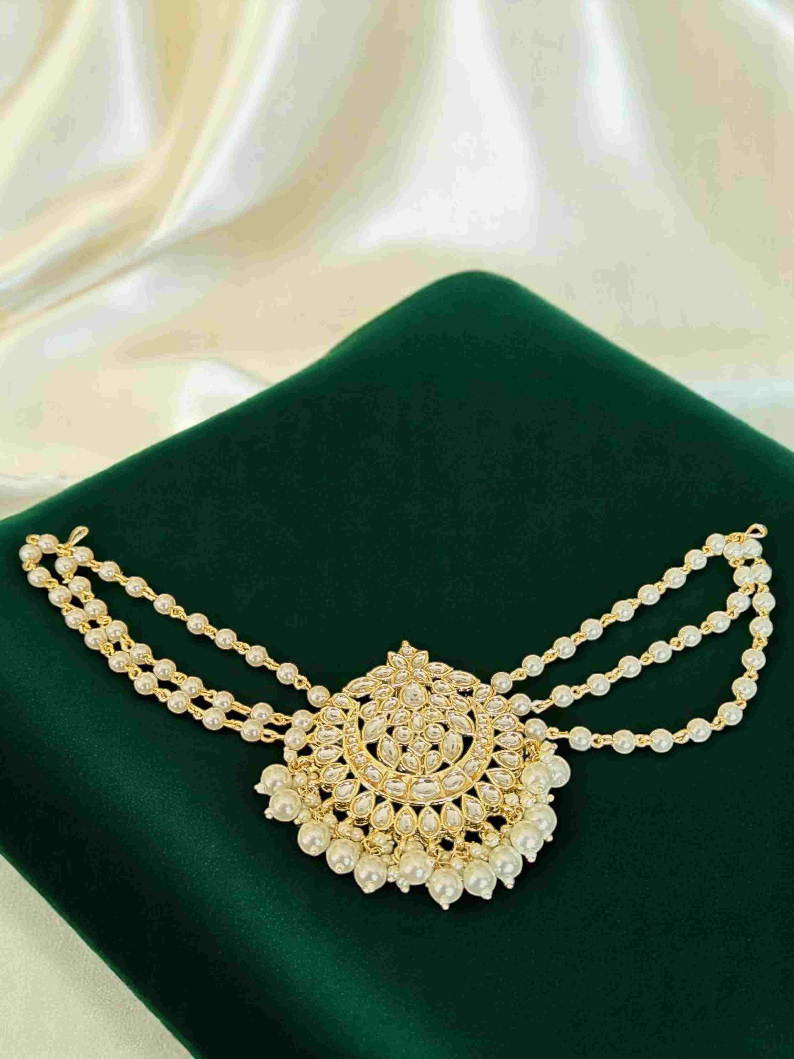 Elegant gold-toned hairpiece featuring an intricate central Kundan design with cascading faux pearls. Delicate pearl chains extend on either side to frame the hairstyle beautifully. Perfect for adding a touch of traditional glamour to weddings and special occasions.